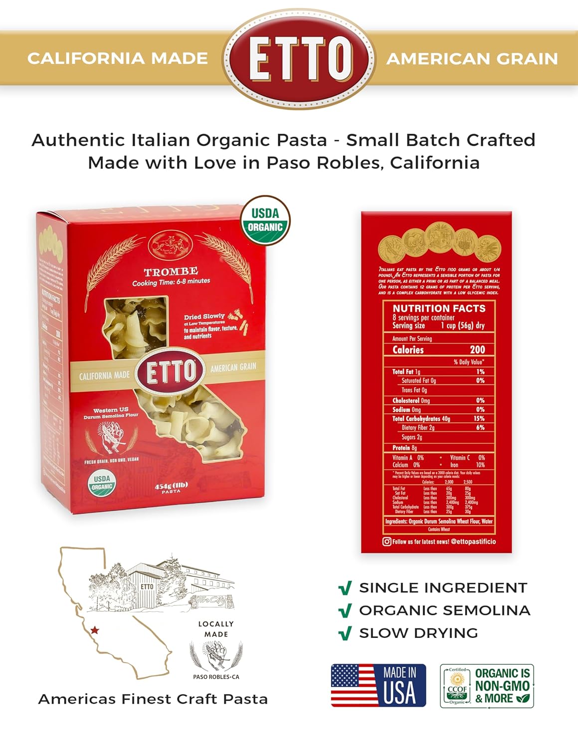 Discover the taste of authenticity with ETTO Organic Trombe Pasta- 6 Boxes (6 Pounds)! ♥ETTO Organic Pasta is small batch crafted from 100% USDA organic semolina durum wheat grown and harvested in America. Our single-ingredient pasta is for families prioritizing health, quality, and authenticity. ETTO premium-crafted pasta is a wholesome, all-natural, chemical-free, and non-GMO choice that complements your healthy lifestyle. Etto Organic Pasta is made in small batches using traditional Italian methods, ensuring superior quality and a rich, authentic flavor that stands apart from mass-produced options. With various unique Italian shapes, ETTO pasta is designed to hold sauces beautifully, transforming everyday meals into gourmet experiences for your family and loved ones. Proudly produced in Paso Robles, California (Tin City), ETTO Pasta blends local artisanal craftsmanship with time-honored Italian pasta-making traditions. Each batch is slow-dried to lock in natural flavors and textures, delivering a perfect al dente experience in every bite. Rich in protein and packed with essential vitamins and minerals, our premium semolina durum wheat enhances your favorite recipes and supports your overall health and wellness. With a commitment to sustainability, ETTO Organic Pasta is made from ethically sourced ingredients, making it as good for the planet as it is for your table and health. Its versatility means it’s perfect for everything from quick family dinners to gourmet dishes. Each unique shape offers a delightful fusion of Californian innovation and Italian heritage, providing a flavorful experience that your family will love! ♥♥♥